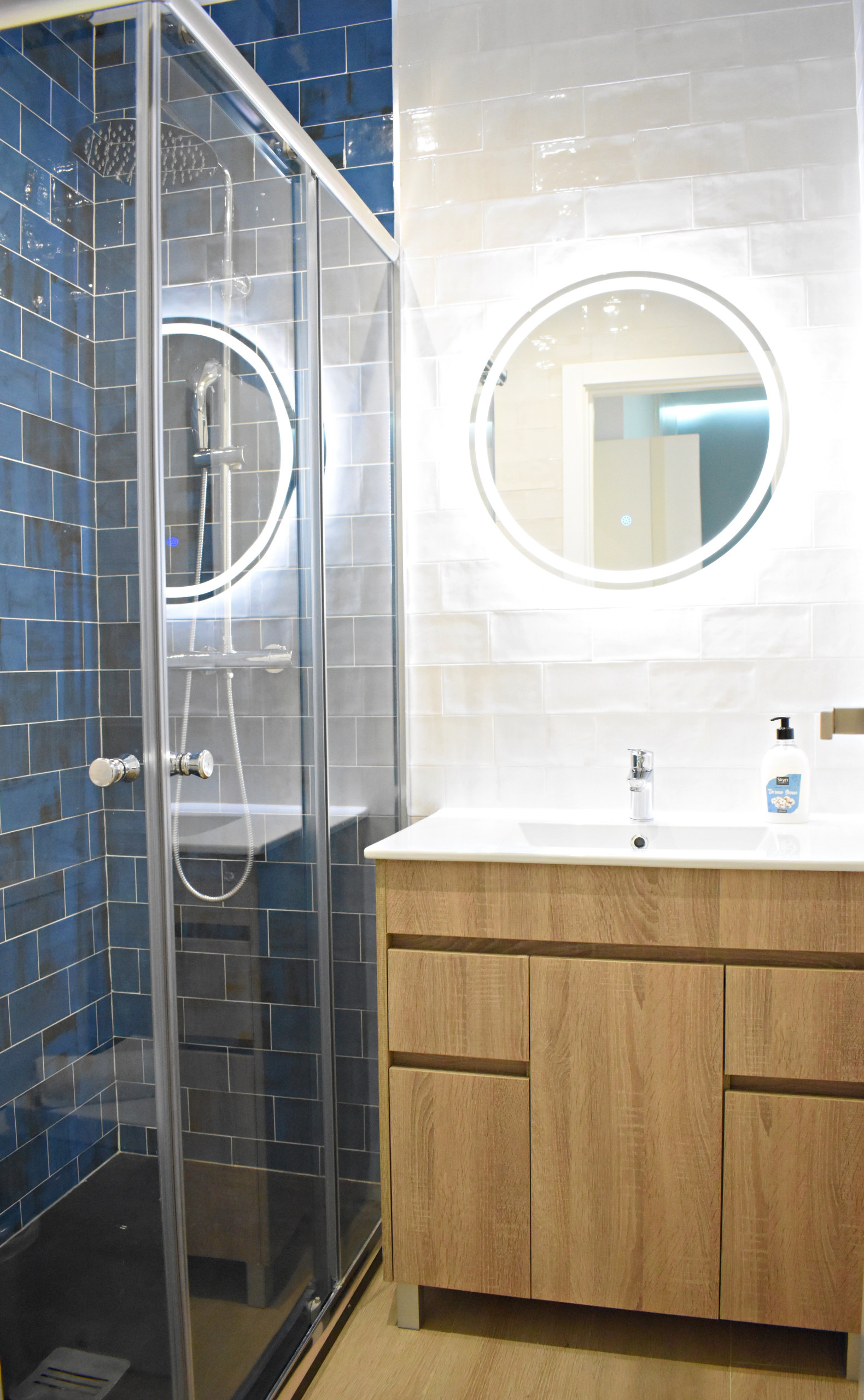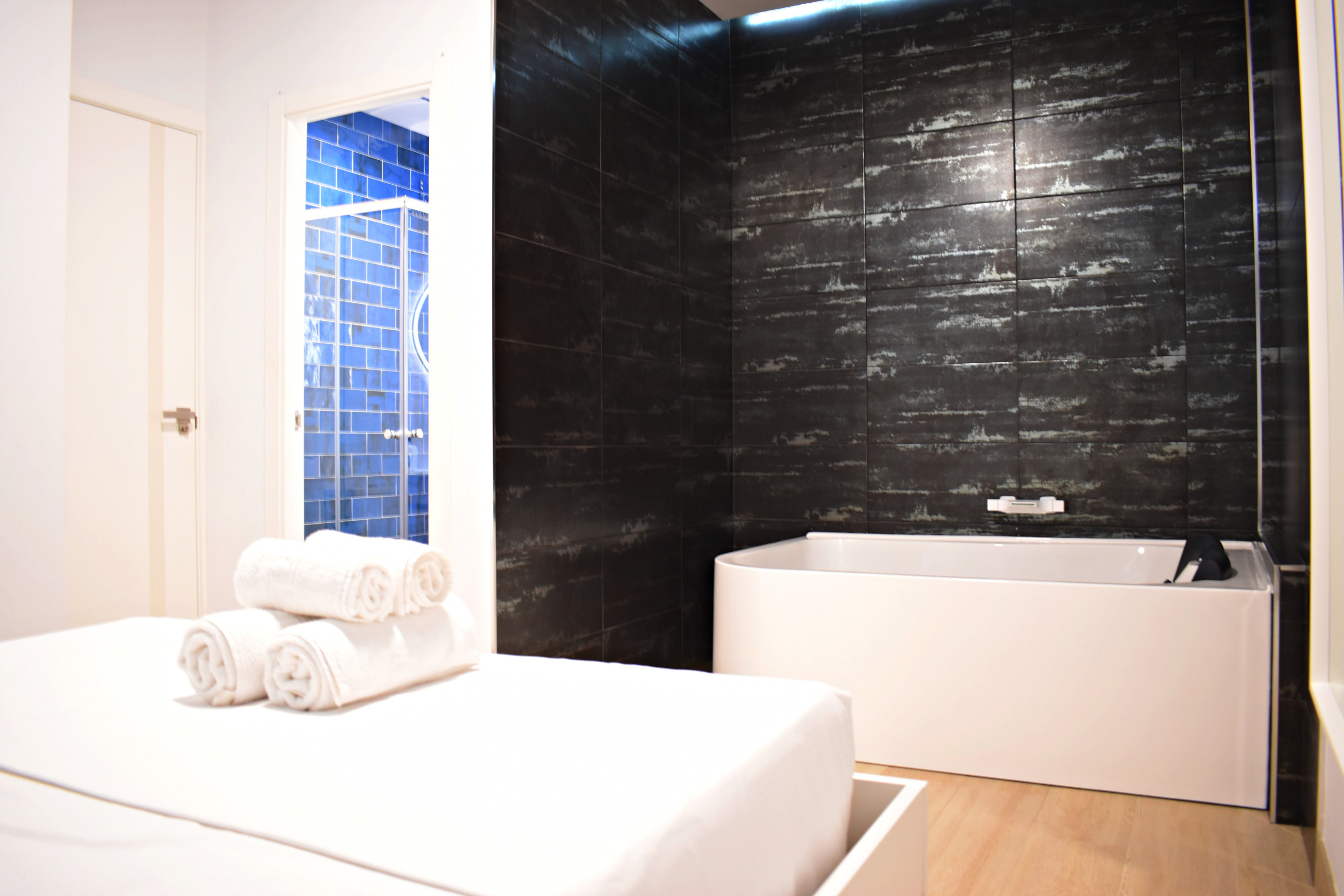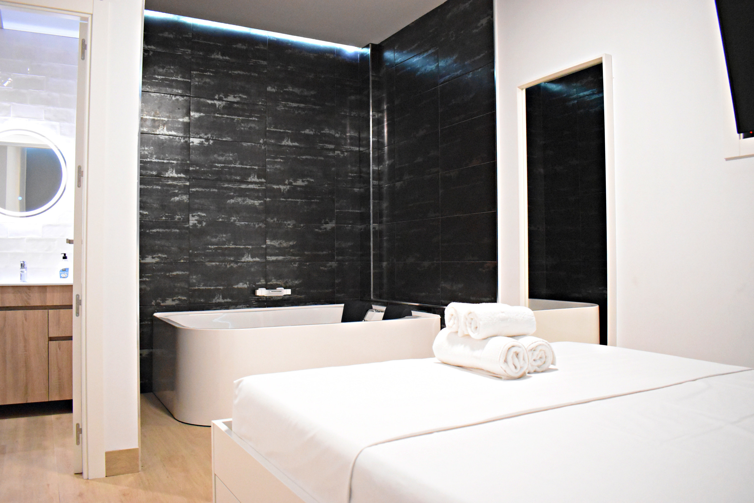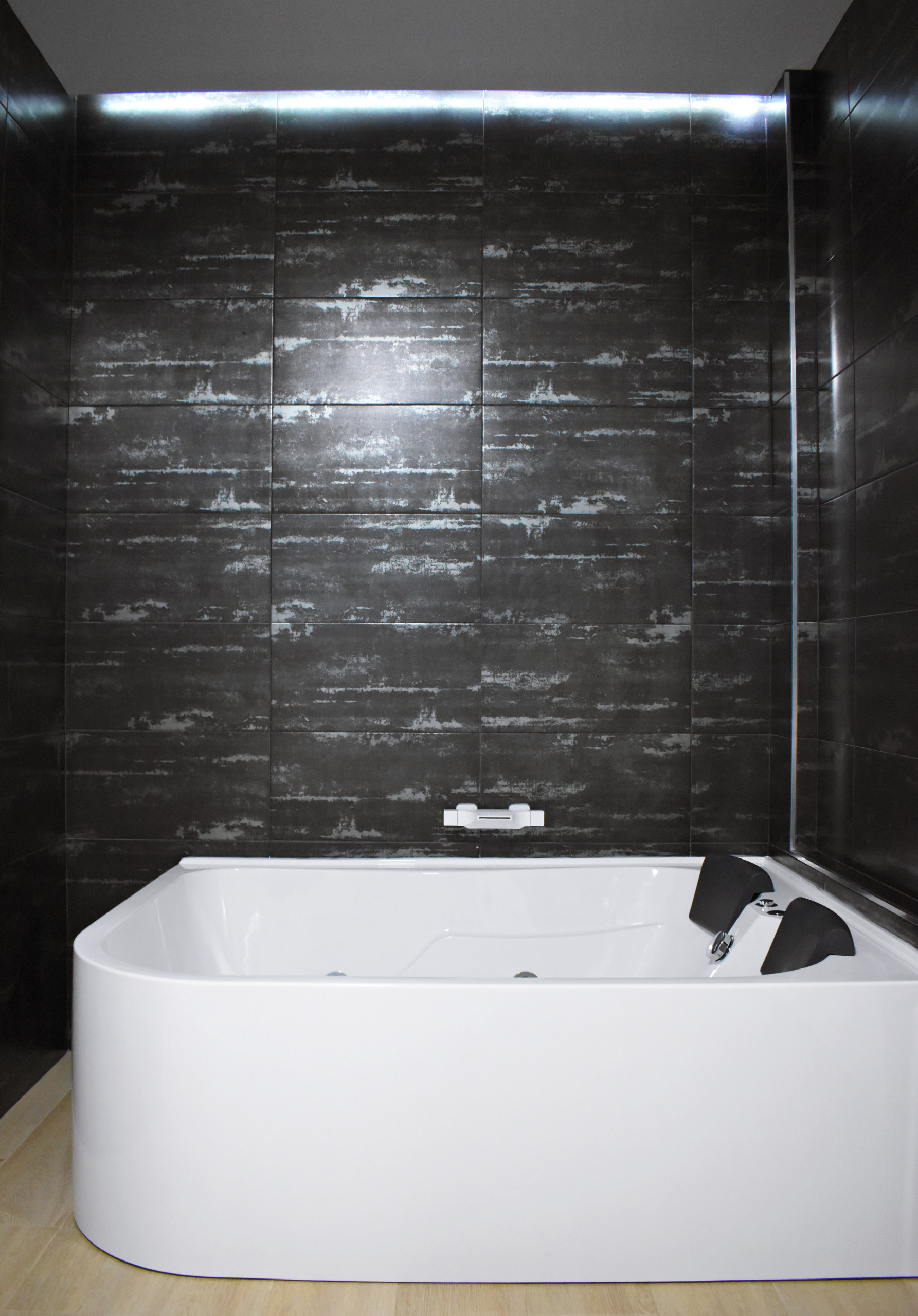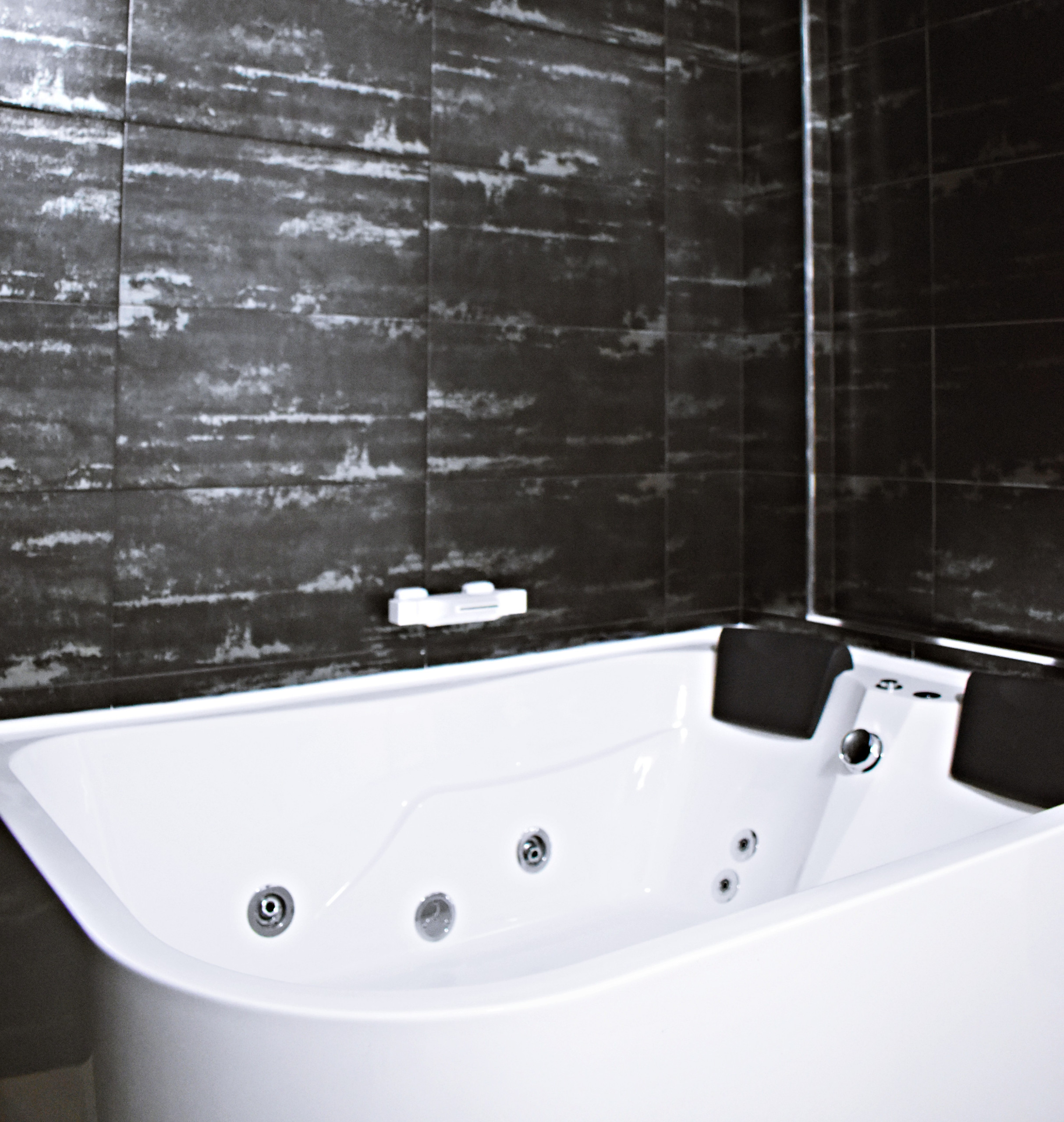 One of the bedrooms has a private jacuzzi inside the room and its own bathroom with shower. Both bedrooms have storage space, double beds and TV.